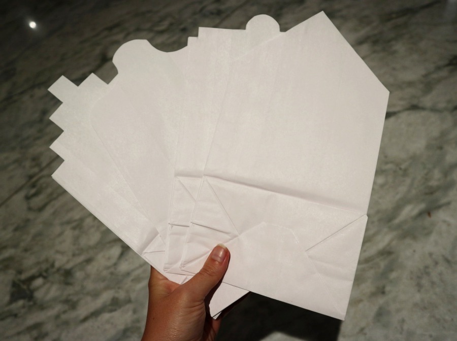 Für die Häuser die 8 stabileren Papiertüten an der offenen Oberseite mithilfe der Dachschablonen zuschneiden (die Schablonen findet Ihr auf der Homepage www.landshuter-mama.de). Für einen Landshuter-Mama-Look mit Wiedererkennungswert haben wir uns bei den Dachformen an den Fassaden der Landshuter Altstadt orientiert. Natürlich könnt ihr euch auch selbst hübsche Dachformen überlegen.