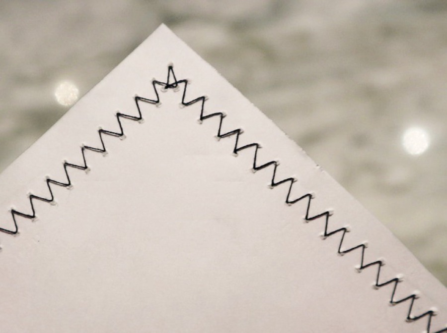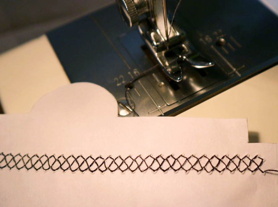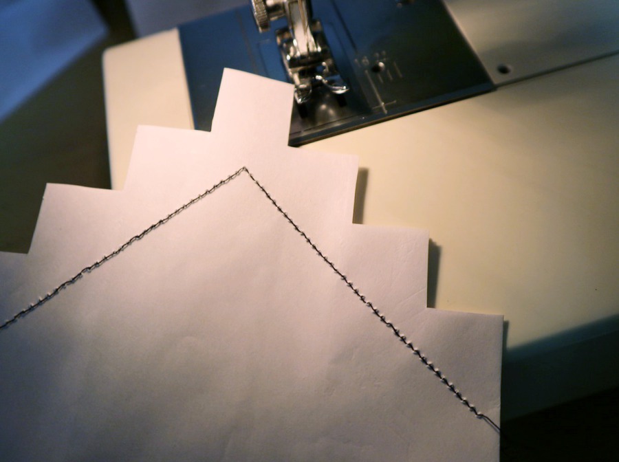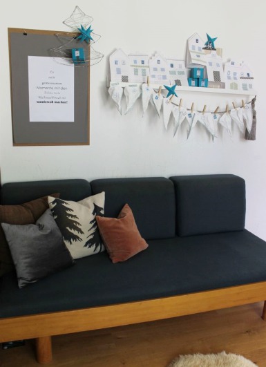 Zum Verschließen die Dächer mit dem grauen und dunkelblauen Faden zusammennähen. Besonders schön wirkt es, wenn Ihr zum Abnähen der verschiedenen Dachformen verschiedene Stiche verwendet. Wenn’s schnell gehen soll, können die Öffnungen auch einfach mit doppelseitigem Klebeband zugeklebt werden.