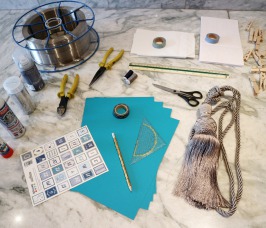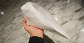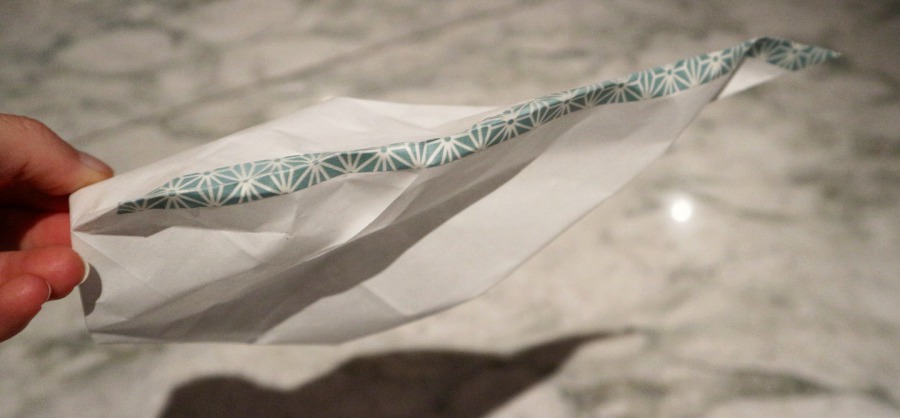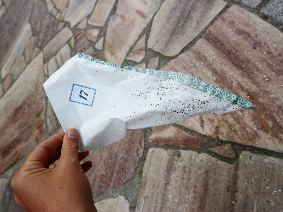 Anschließend die Öffnung mit dem türkis-gemustertem Tape zukleben und die Tüte vorsichtig zerknüllen, sodass sie eine charakteristische Zapfenform erhält.