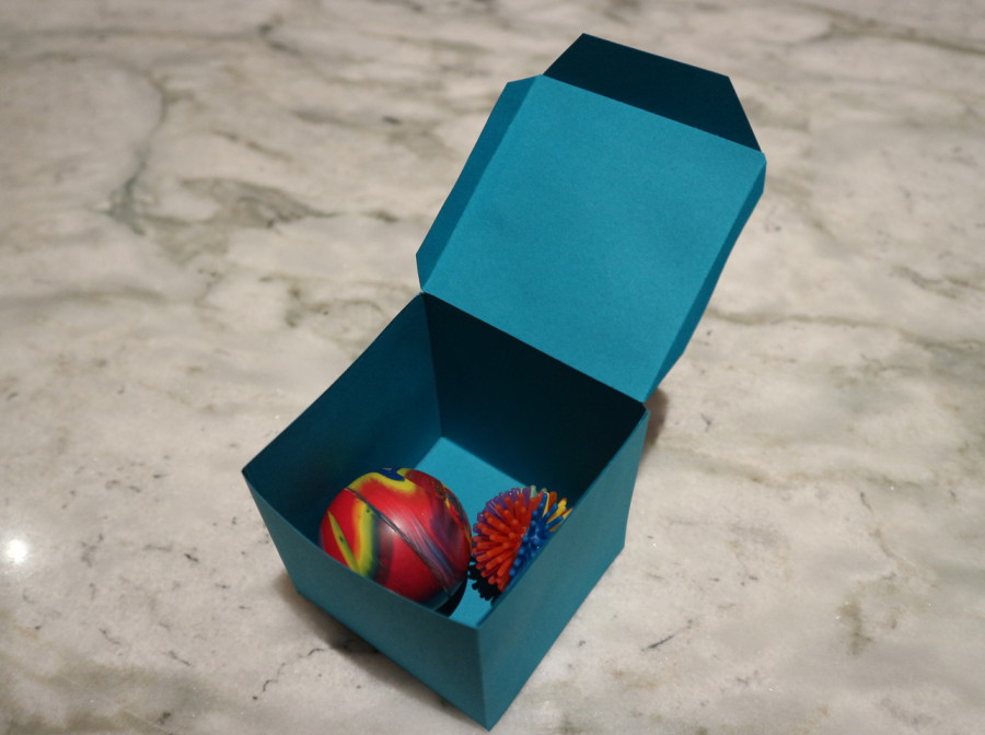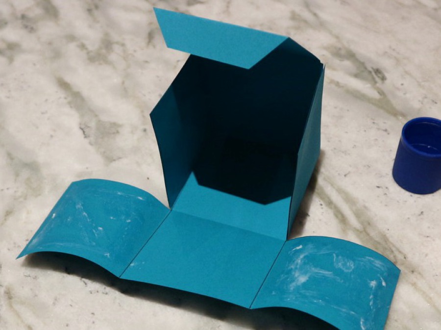 Die äußeren Felder wie abgebildet aneinander Kleben, sodass eine kleine Schachtel entsteht.