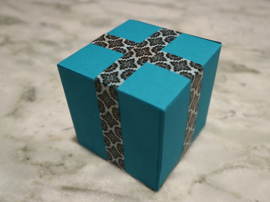 Die Schachtel befüllen und mit dunkel-gemustertem Masking-Tape zukleben.