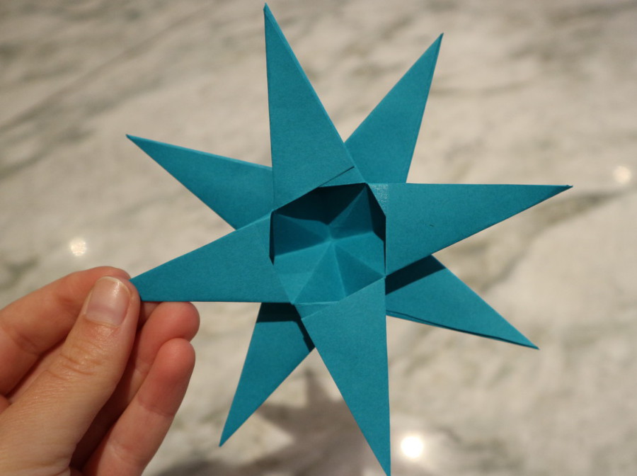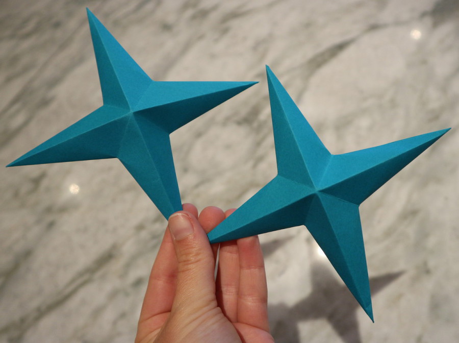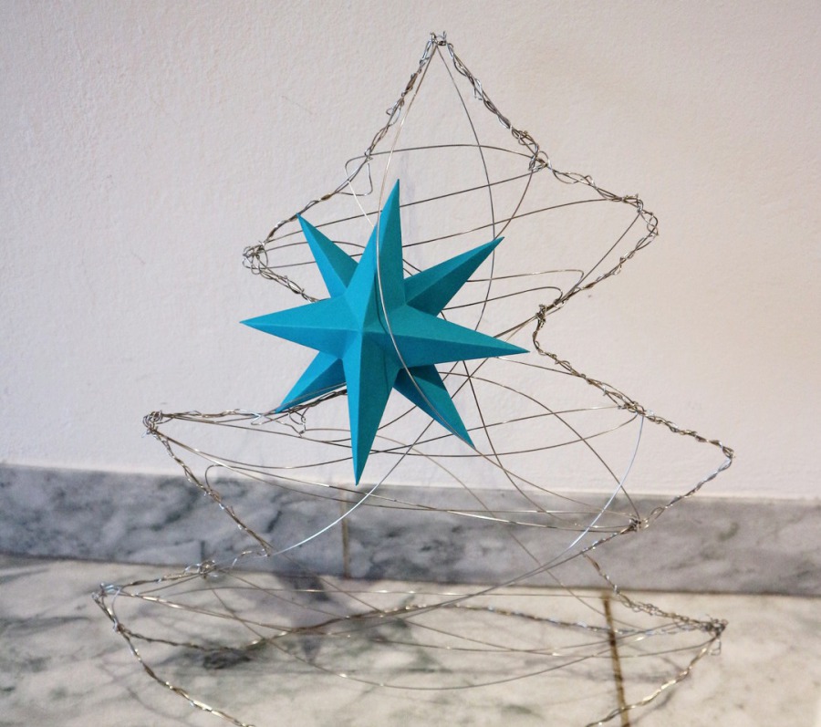 Jetzt zeigen wir Euch noch eine einfache Falt-Technik für tolle 3D Sterne, mit denen Ihr den Drahtbaum dekorieren könnt. Zunächst aus dem Tonpapier durch Falten 2 Quadrate ausschneiden. Jedes Quadrat 4 mal in der Mitte falten. Das Quadrat an den Kanten bis zur Hälfte einschneiden, Falten und zusammenkleben, sodass 4 Zacken entstehen.