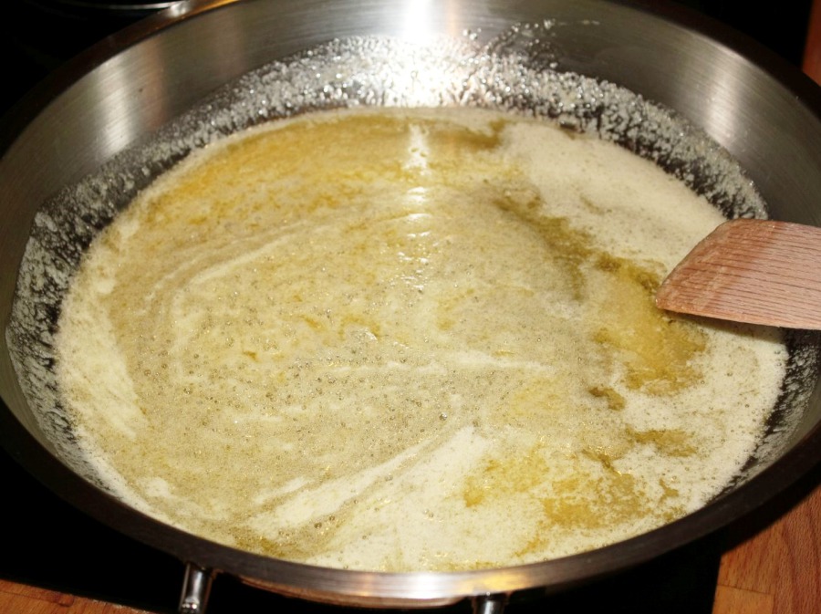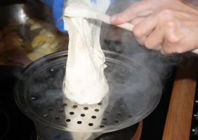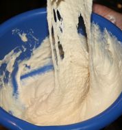Das Mehl mit dem Salz in eine hohe Schüssel füllen, Sojamilch nach und nach zugießen und rühren. Das geht prima mit dem Handrührgerät und dem Knethaken, funktioniert aber auch mit einem Kochlöffel. Teig so lange rühren, bis er glatt ist (also keine Klümpchen mehr vorhanden sind) und in langen Zapfen vom Löffel zieht. Ruhen lassen.