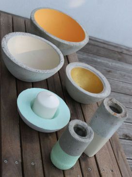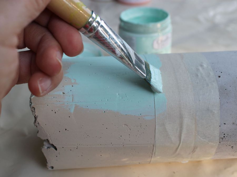 Nach Geschmack bemalen. Schön ist es wenn der Beton noch teilweise sichtbar bleibt. Deshalb bei den Vasen zum Bespiel nur den unteren Teil anmalen. Hierfür das Klebeband anbringen, malen und nach dem Antrocknen wieder entfernen. Die Schalen sehen sehr schön aus, wenn sie nur innen bemalt sind.