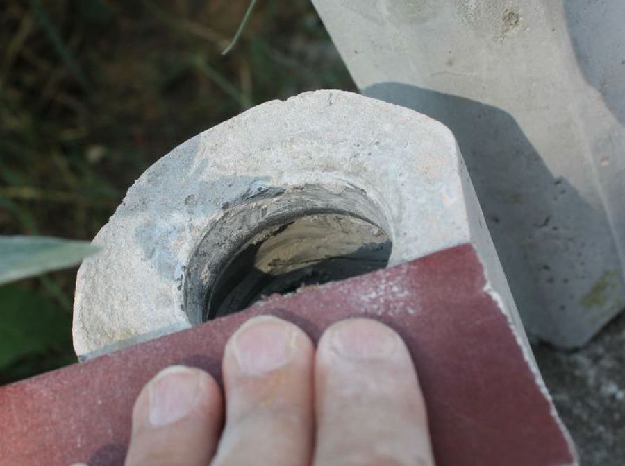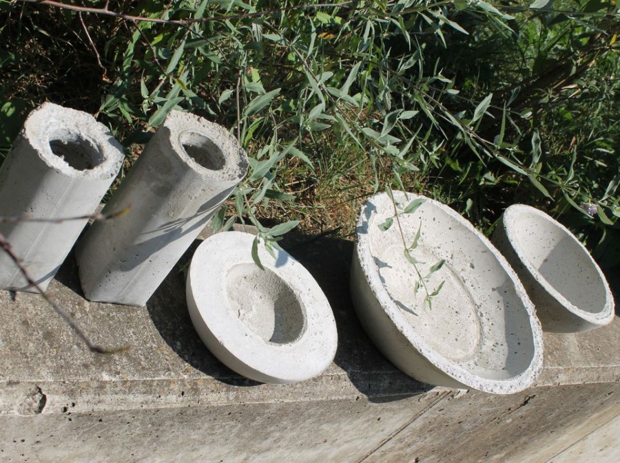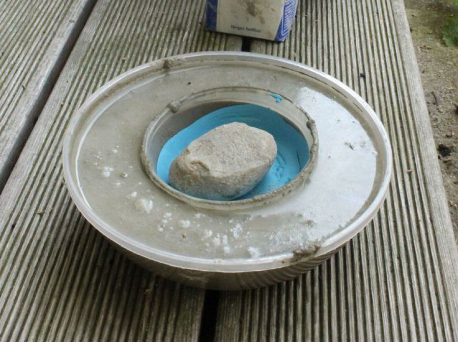 Die Schüsseln mit Öl einreiben, dann die größere Schale ca. zu 1/3 mit Beton füllen und die zweite kleinere Schale hineindrücken bis der Beton fast zum Rand reicht. Die innere Schüssel mit Steinen oder Sand beschwehren.