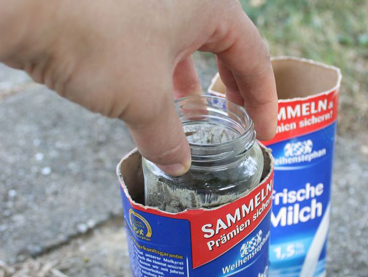 Die Milchtüten oben abschneiden und ca. zur Hälfte mit Beton füllen. Dann das Babygläschen hineindrücken bis der obere Rand im Beton verschwindet.