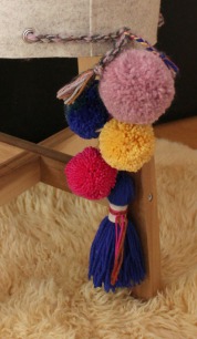 Nun alle Bommel und Quasten durch eine Öse fädeln und mit den Enden der Wollkordel zusammenfassen und alles verknoten. Voilà – euer neuer Hocker im angesagten Ethnolook!