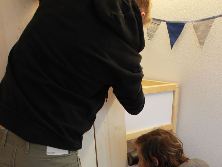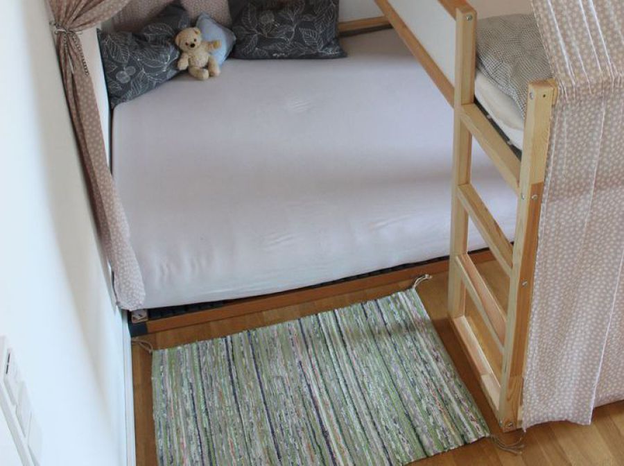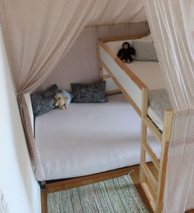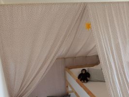 Tipp: Wir haben unten noch eine 1,40m breite Matratze samt Lattenrost eingeschoben. Das ergibt weiteren Schlaf- oder Kuschelraum. (Dafür muss bei dem Kurla-Bett von Ikea ein Teil der Bodenleiste entfernt werden.) Die Spitze des Daches sitzt deshalb auch bei 1,47m von der Wand aus. Dann fällt der Vorhang direkt vor der Matratze zu Boden.