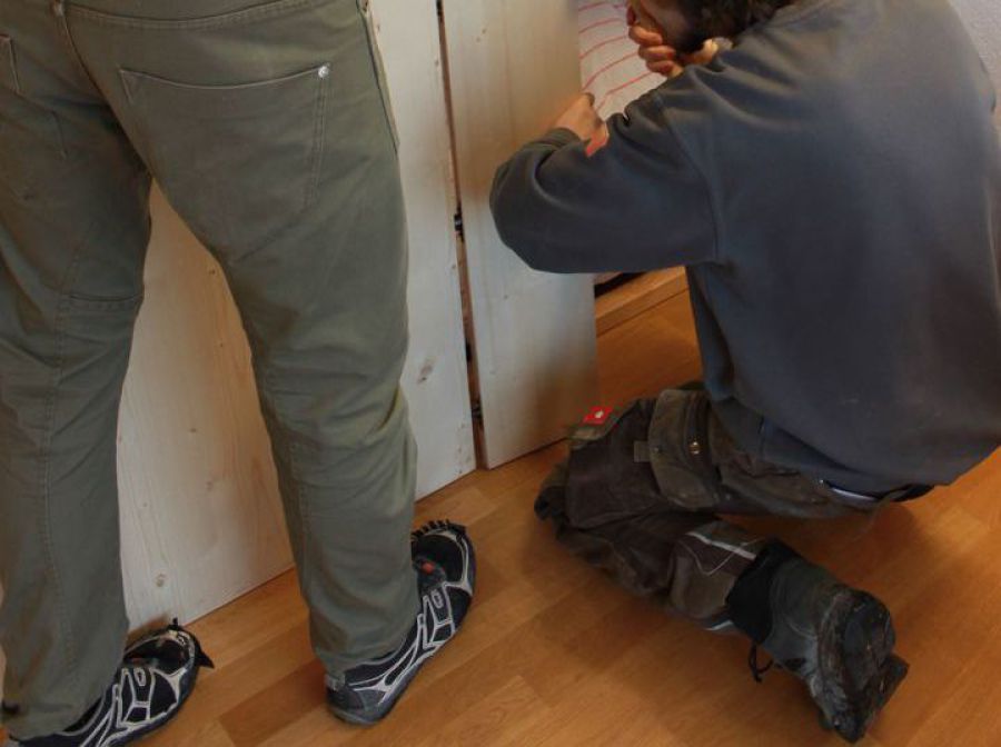 Die Hauswand muss an einer Stelle, am besten zur Wand hin geteilt werden, sonst passt die Platte nicht durch ein 2m hohe Zimmertüre. Wenn der Zuschnitt in einer Schreinerei angefertigt wird, werden dort Verbinder eingesetzt. Dann müssen die Teile im Zimmer nur noch zusammengesteckt werden. Dafür braucht es meist einen Gummihammer.