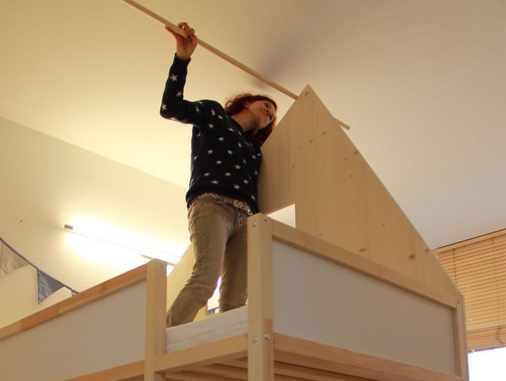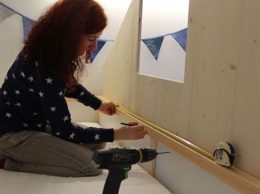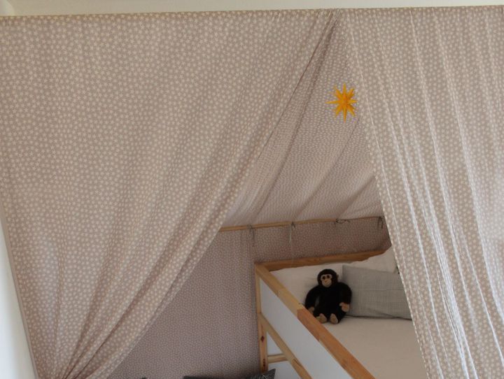 Das Hochbett in ca.1m Abstand von der Wand platzieren, die Vorhangstangen durch die gebohrten Löcher schieben auf das gewünschte Maß kürzen. Oben etwas überstehen lassen. Dann kann man vorne am Haus etwas daran aufhängen.