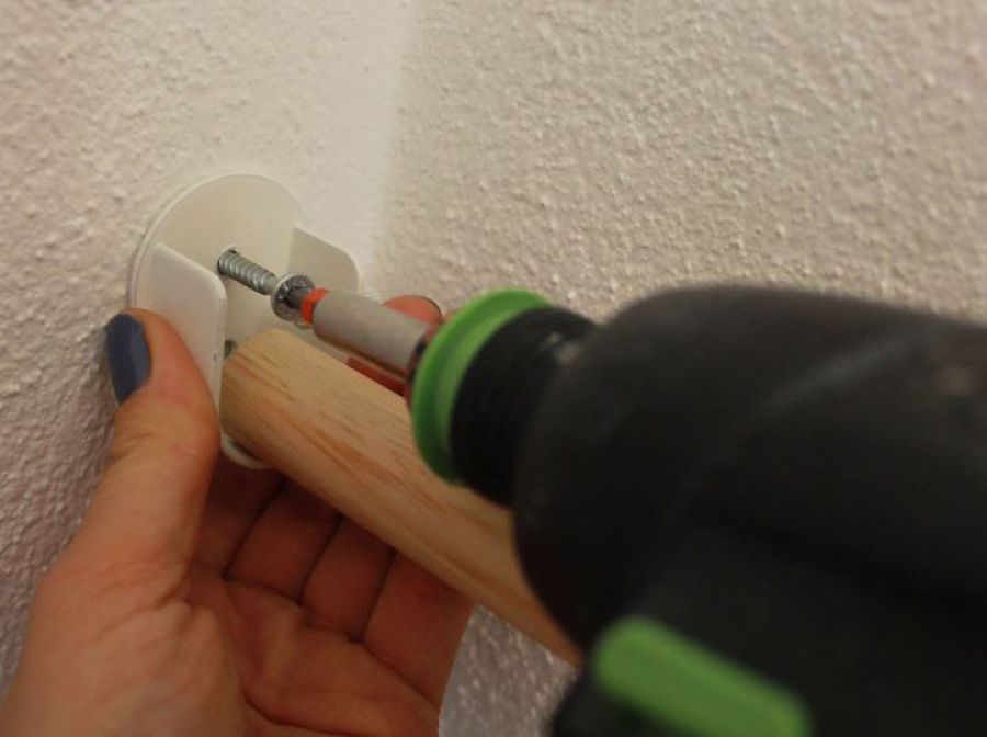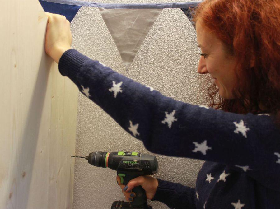 Die Stoffbahn über der Freifläche beginnt an der Fußleiste der Rückwand und wird dann über beide Stangen gelegt und bis zum Boden hängen gelassen. Hinten an der Fußleiste den Stoff mit Klettband befestigen. Vorne einen runden Haken in die Wand setzen. Dort den Rest des Webbandes durchfädeln und den Stoff damit raffen und festbinden.