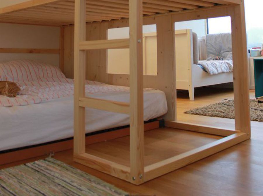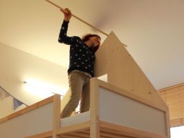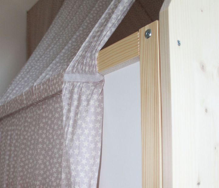 Wichtig: Dort wo die Leiter am Hochbett angebracht ist muss der Winkel zum Dach steiler sein, damit der Vorhang nicht beim Einsteigen ins Bett stört.