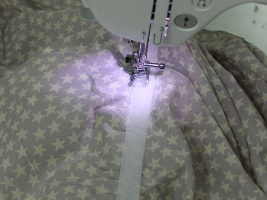 Dann vom Boden bis zur Bettkante messen und dort ein Klettband festkleben, die andere Hälfte des Klettbandes an der entsprechenden Position am Stoff festnähen.