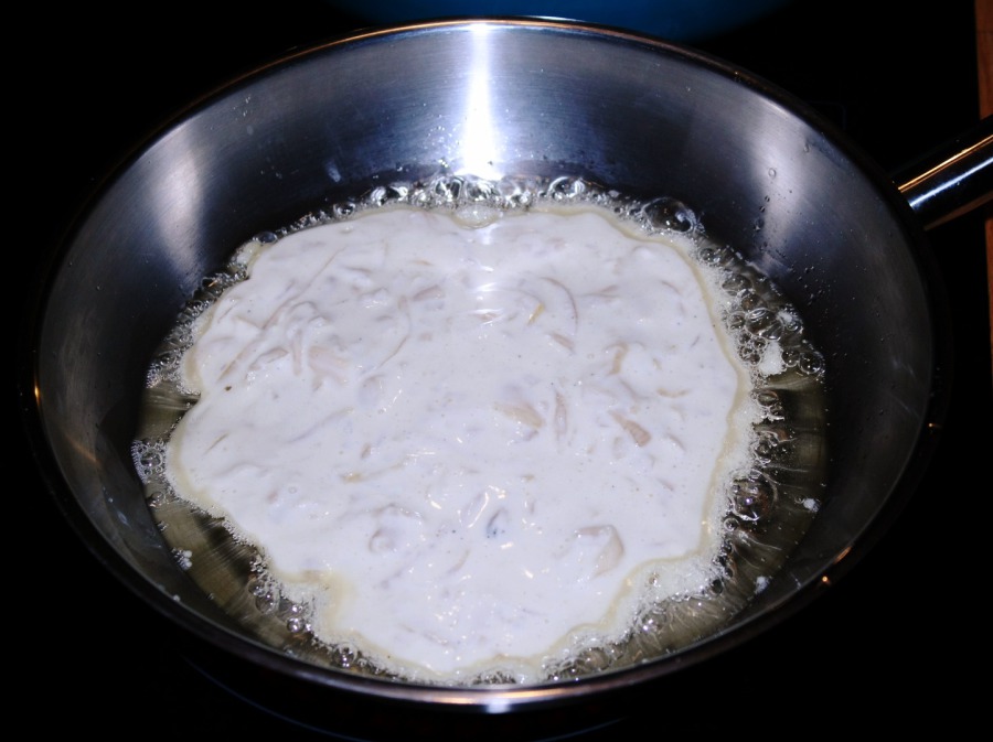 Das Mehl mit dem Salz, der Sojamilch und dem Backpulver zu einem glatten Teig verrühren und zum Quellen stehen lassen.