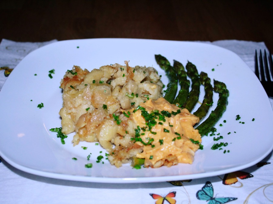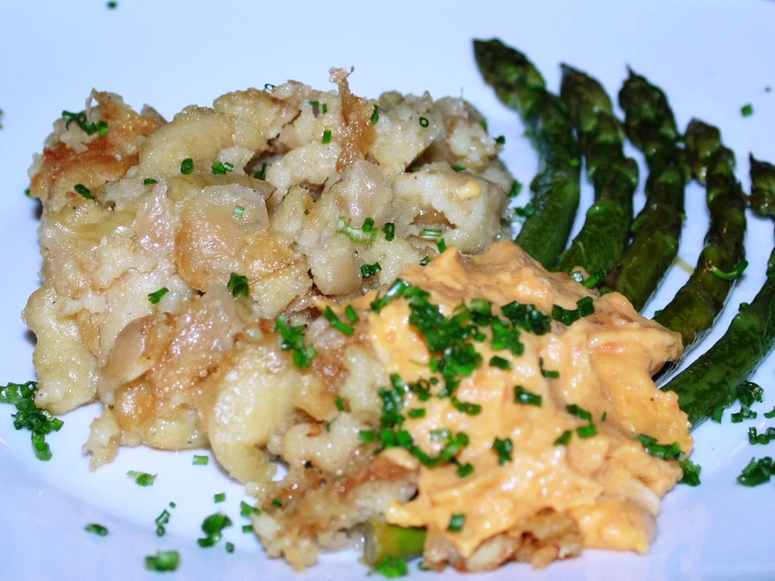 Tipp: Der Schmarrn kann, je nach Vorliebe, mit weiteren Gewürzen abgeschmeckt werden, z. B. Petersilie, Paprika, Koriander, Schnittlauch oder Bärlauch. Er kann als nicht vegane Variante mit Eier und Milch hergestellt werden, auch mit Käse überbacken schmeckt er wunderbar.