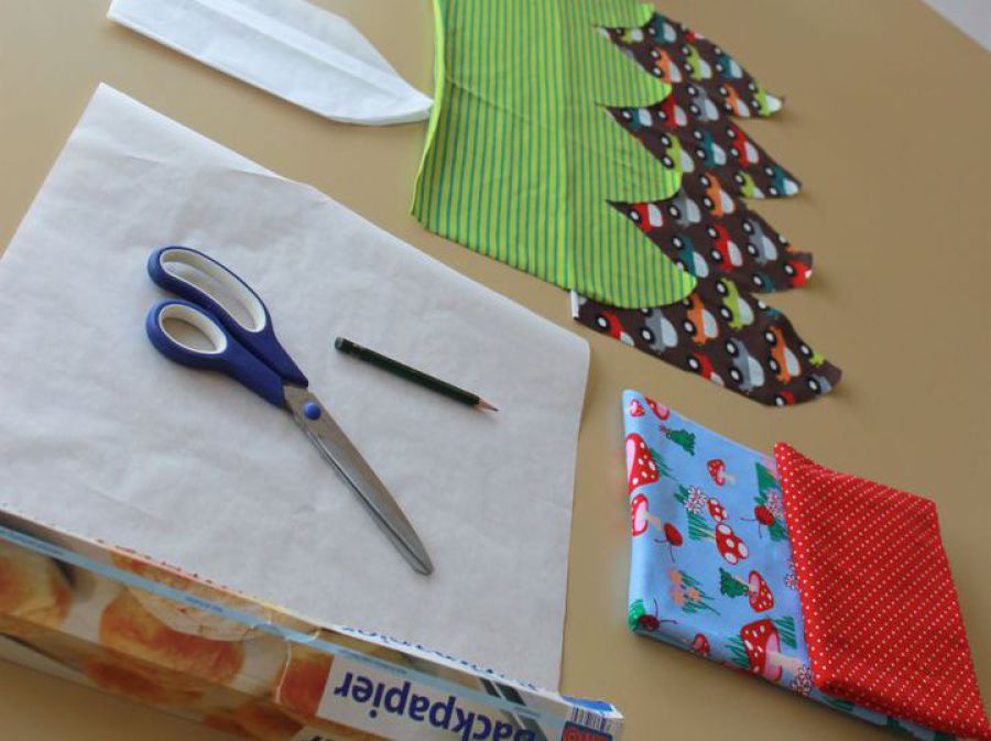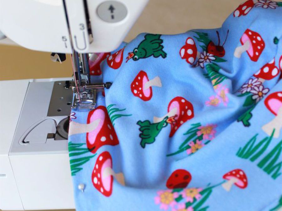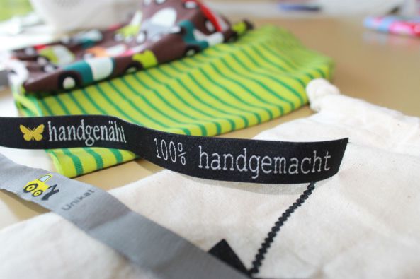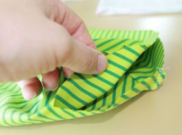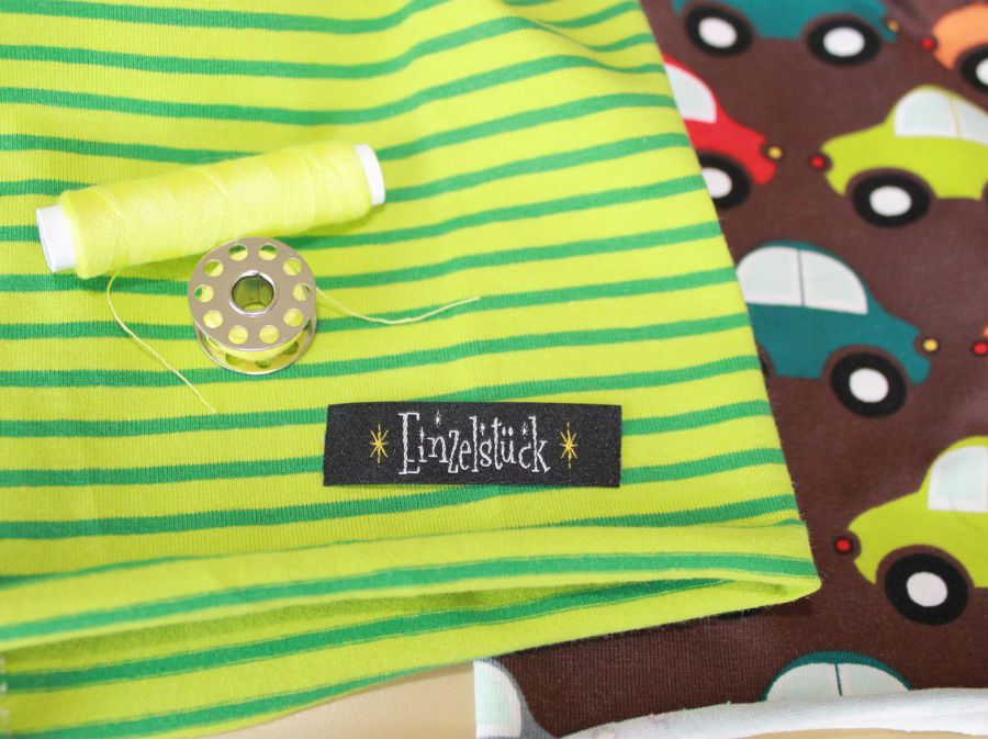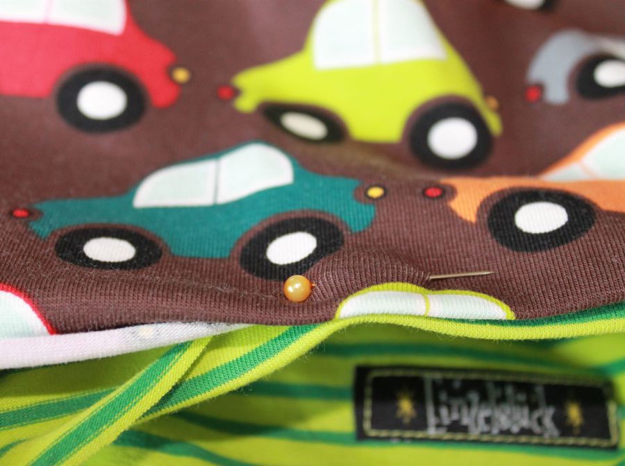 Und zwar so, dass beide linken Seiten innen und die durchgehenden Nähte aufeinander liegen. Feststecken und Naht schließen. Fertig!