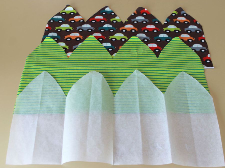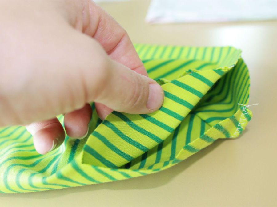 Nun die geschlossenen Nähte übereinanderlegen (siehe Bild) und die verbliebene Öffnung schließen. Fertig ist die erste Mütze. Auf die gleiche Weise die zweite Mütze nähen.
