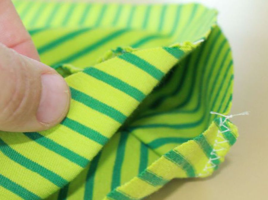 Nun werden zunächst zwei einzelne Mützen genäht. Hierfür den Stoff mit der rechten Seite nach innen in der Mitte falten. Die äußere Naht bis zur Spitze mit einem dehnbaren Stich schließen. Ebenso auf der gegenüberliegenden Seite.