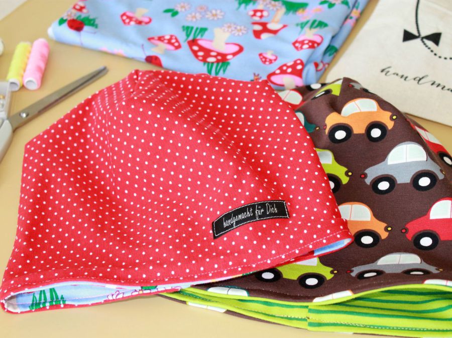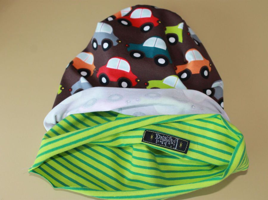 Diese Wende-Beanie aus bunten Stoffen hält kleine Köfpchen warm und sieht super aus.