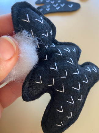 Näht mit einer Nähmaschine oder auch per Hand, die Vorder- und Rückseite des Aufhängers mit einem geraden Stich zusammen. Lasst eine ca. 2cm große Lücke. Hierdurch füllt ihr das Filzmobjekt mit Bastelwatte. Mit einem Bleistift lässt sich die Watte gut in die kleinen Ecken drücken. Danach schließt ihr die Lücke.